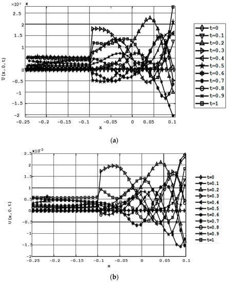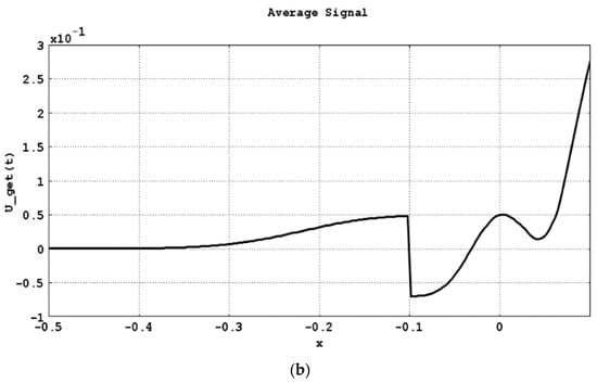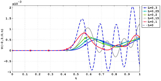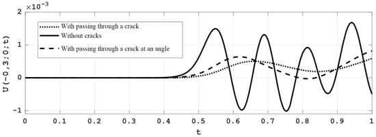 Graphic representation of the signal at the point (−0.3; 0) during the time interval [0; 1] of passing through defects such as cracks, which are specified in the form of (5) and (8), and through the defect-free area (time in milliseconds, U in micrometers).