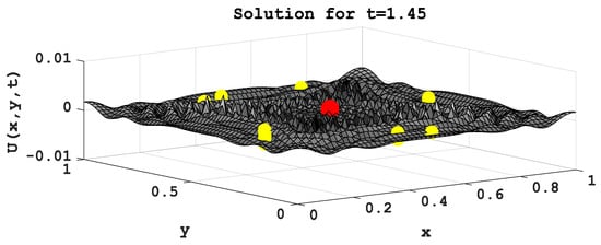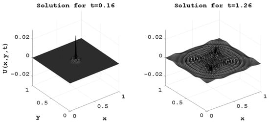 Figure 8 shows the main simulation results for (13) and (14) by the finite difference method. For optimization (13), a classical genetic algorithm was used. The computational grid—60 × 60 nodes, the number of bits for encoding in the genetic algorithm—w = 32. The number of iterations of the classical genetic algorithm—100. The number of computational experiments—5. Classical existing methods were used to find the numerical solution of the hyperbolic equation—the method of finite differences and finite elements [41,42,43].