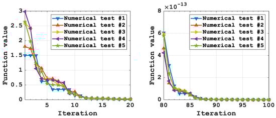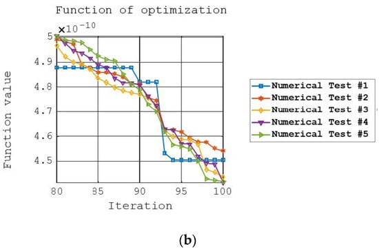 Convergence (11) of the optimization mathematical model (12) and (13) by the classical genetic algorithm (left—first 20 iterations; right—last 20 iterations).