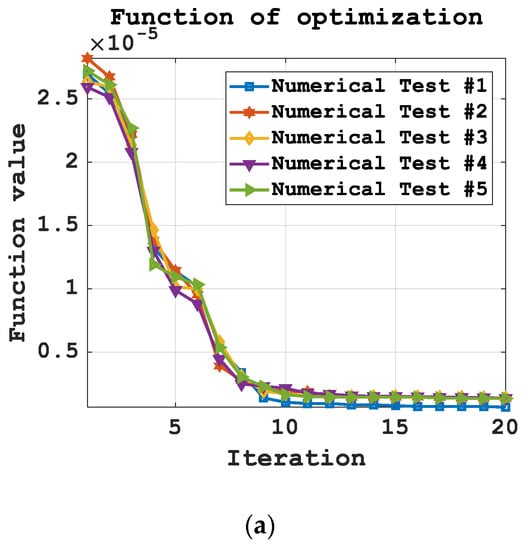 Figure 6 displays the data obtained from the sensors, the geometric arrangement of which is given in Table 1. It should be noted that all sensors receive data during the same period of time. Figure 7 shows the value of the objective function (12) of the mathematical model (12) and (13) using the classical genetic algorithm [32,33] at the first 20 and at the last 20 iterations.