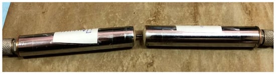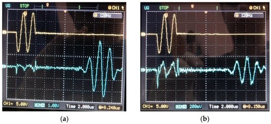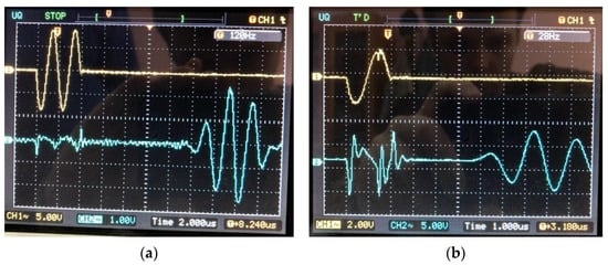 Determination of wave propagation velocity. The signals obtained experimentally are shown in Figure 12. The time it takes for the signal to pass from the emitter to the receiver is 14 μs, t = 13.2·10−6 s. Next, the converters were connected (Figure 13) and the oscillograms were taken (Figure 14) to determine the total signal delay time in the waveguides of the emitter and receiver [51].