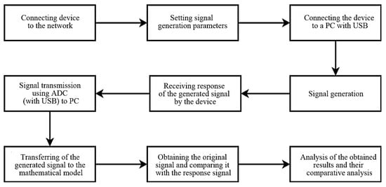 To increase the reliability of the received signals, multiple studies were carried out according to the strategy shown in Figure 15. The obtained experimental data were averaged, which made it possible to minimize the influence of interference such as white noise. The generated signals were transmitted using an ADC via a USB connection to a PC and had the form shown in Table 5.