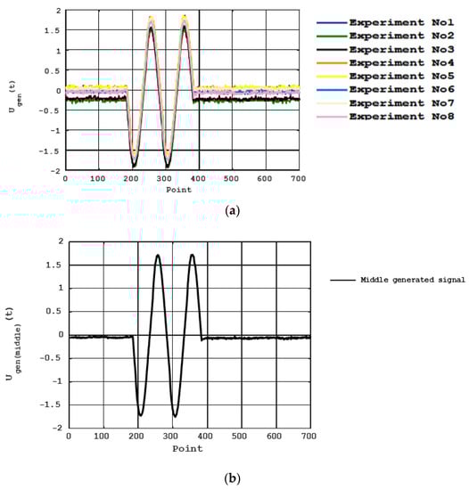 Table 5 contains data about the signals generated by the developed ultrasonic testing device. The number of experiments performed was eight. A graphical representation of the generated signals and their average values are shown in Figure 16.