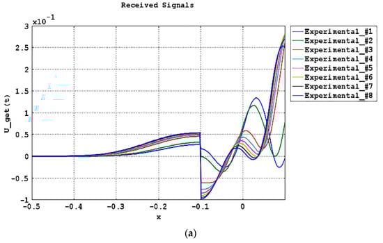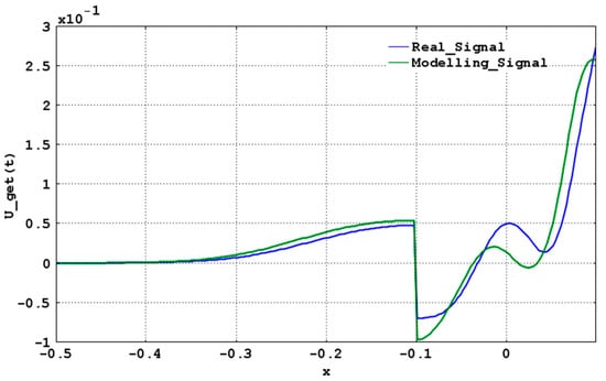 The developed mathematical models were verified. For this verification, we used the results of physical experiments. We compared signal responses obtained from experiments and calculated by the mathematical model (the specification of the generated signal is shown in Figure 16b). The comparison results are shown in Figure 18. The signal responses obtained in the experiments and modeling have small deviations. Therefore, the mathematical models are acceptable for practical application.