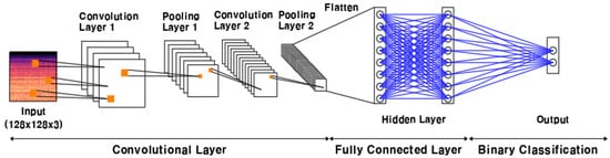 Figure 1 shows the representative structure of the CNN. For input image data (128 × 128 × 3). the convolutional layer creates a feature map that extracts the features of the image, whereas the pooling layer reduces the number of operations by reducing the extracted feature map. Identified features that have undergone multiple convolution and pooling processes are finally classified in the fully connected layer [,,,].