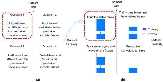 Figure 2 shows fine-tuning options according to various data sizes and similarities. Figure 2a shows four conditions according to the sizes and similarities of the dataset, and Figure 2b shows the transition learning model and the classifier’s fine-tuning options. In this study, the entire relearning fine-tuning technique, which is the first quadrant condition with the highest validation accuracy, was selected and applied to model training after all the fine-tuning techniques of the four conditions were performed.