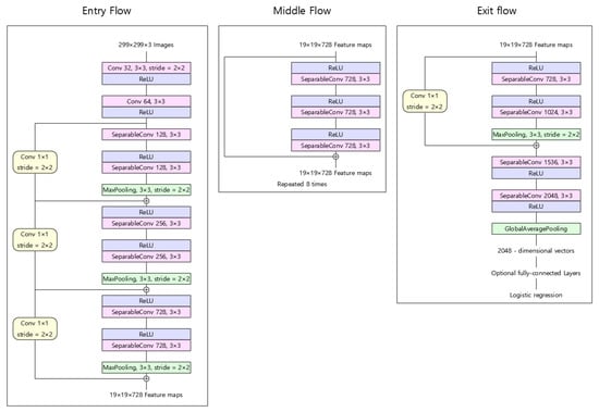 To overcome these disadvantages of CNN, Chollet, et al. developed the Xception model by configuring separable convolution layers, as shown in Figure 3. The separable convolution layer method connects the feature maps obtained from the existing convolution layer, obtains a feature map for each channel through depthwise convolution, and then reduces the number of channels through pointwise convolution. Using this method, the amount of computation of the convolution layer is significantly reduced, and it is possible to reduce the weight of the CNN model []. The structure of Xception is shown in Figure 4.