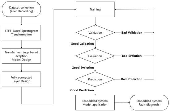 In this study, sound data were directly collected at the workplace and then converted into a spectrogram using the STFT technique. The Xception transfer learning model was then applied to the converted spectrogram to complete the rotor fault diagnosis algorithm. Finally, the completed fault diagnosis algorithm was embedded in the embedded system to perform a validation experiment on the real-time fault diagnosis performance of the rotating body. Figure 5 shows the development procedure for a fault diagnosis system using the CNN-based transfer learning model conducted in this study.