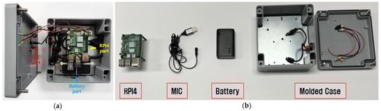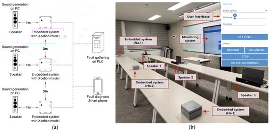 In this study, a set of experiments to verify the proposed algorithm for diagnosing roller failures was configured as shown in Figure 10. The sound detection module, a unit diagnosis system, is a Raspberry Pi4-based embedded system type controller equipped with a CNN-based Xception model. Since the arrangement of the rollers at the work site is consistently located for a long distance, each embedded model was placed at 3 m intervals corresponding to the maximum separation distance in the laboratory, and a speaker generating the sound of the rollers was placed 1 m in front of the embedded module. Then, using a speaker, the sound data of the normal and faulty state of the roller secured at the actual work site was output, and a diagnostic experiment was performed for 1 h once every 4 s. Additionally, the embedded system developed in this study diagnoses the failure of the conveyor belt roller sound and transmits the diagnosis result to PCs or PLC equipment through Wi-Fi. Each of the conveyor belt roller sound detection modules distributed around the conveyor belt rotating body collects ambient sound data and performs preprocessing on the collected data. For the experiment, the PWB-05 battery was used as the power source, BM-350U was used as the microphone, and BZ-SP600X was used as the speaker. Then, the sound data that have gone through the preprocessing process are analyzed for the failure of the rotating body by applying an artificial intelligence model. The failure determination result of each module obtained through this process is transmitted to the upper controller, and instead of the entire existing sound data, only the failure determination result is transmitted, thereby reducing the load concentrated on the PLC or PCs. Figure 11 hows the internal equipment of the embedded system used in this experiment.
