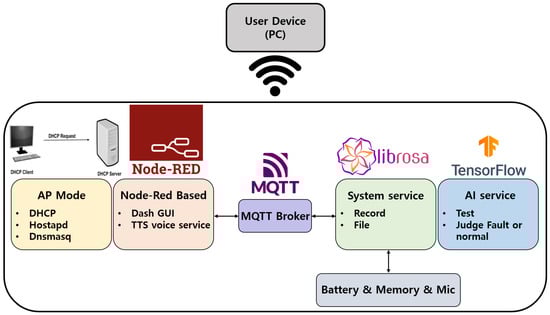 Figure 12 shows a schematic diagram of an embedded software system. The conventional diagnosis of abnormalities in the rolling element required a worker to visit the site and analyze the sound and condition of the roller. Therefore, the implementation of wireless communication between a system that diagnoses the presence of abnormalities in the field in real time and a remote supervisor’s monitoring system is a very important issue. In this research, we introduced the RPI4 embedded system to build these environments. Embedded systems now include servers such as Dnsmasq, Hostapd, etc., for remote connections, enabling wireless local networks. The way the whole system works is designed with a GUI based on Node-Red. Rotating body sound data measured in real time was used to determine the normality and failure of the conveyor belt through an artificial intelligence model installed in RPI4, and the determination results were stored in a USB memory. At the same time, the discrimination result can be checked in real time on a remote PC through MQTT. The user interface outputs the result of determining whether it is normal or malfunctioning, the distance between the roller and the recorder, and the number of recordings.