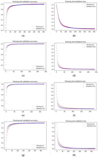 Comparison of training and validation results in various transfer learning models should be listed as: (a) Xception accuracy; (b) Xception loss; (c) VGG16 accuracy; (d) VGG16 loss; (e) VGG19 accuracy; (f) VGG19 loss; (g) ResNet50 accuracy; (h) ResNet50 loss.