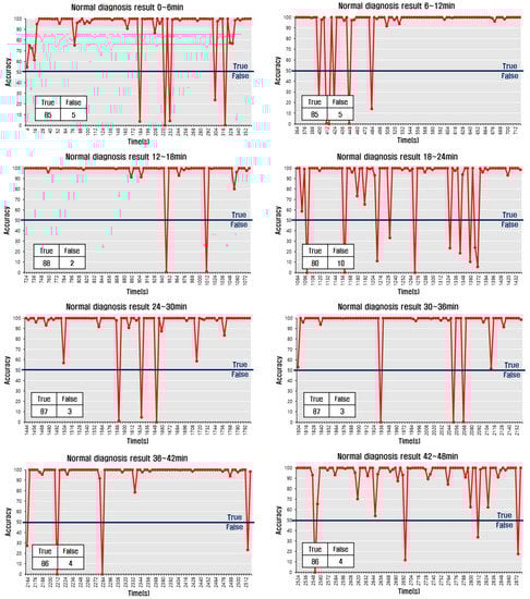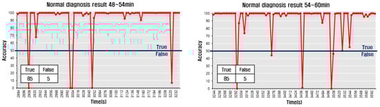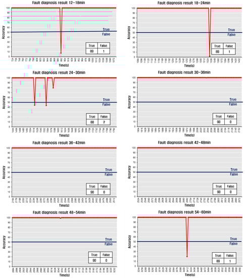 Figure 15 shows the result of fault determination for 900 fault sound data for 1 h in 6 min intervals using the embedded system. Only 5 of 900 pieces of data showed judgment errors.