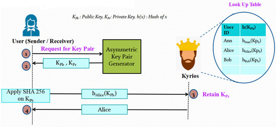 Each user, whether a transmitter or a receiver, must correctly register. They will use an asymmetric approach to generate their public-private (KPb-KPr) key pair. The user will then communicate to Kyrios the hash of the public key h (KPb) while keeping the private key a secret. The SHA-256 algorithm is used to generate the hash values. After successful registration, Kyrios will create a special User ID and provide it back to the user. Additionally, Kyrios will save the results in a look-up table for later use. This phase is depicted diagrammatically in Figure 2.