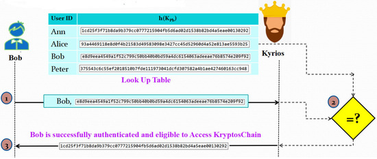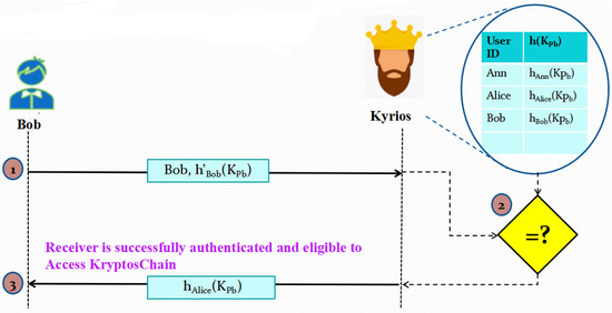 Sender must log into KryptosChain using a special user ID and hash of his public key to transmit a message. The hash Kyrios just received will be compared to the hash in his look-up table. Only in the event that the hashes match will the sender be given access. As a result, Kyrios has verified the sender’s identity, allowing them to access KryptosChain to add or read blocks. The block diagram of the sender authentication process is shown in Figure 3.