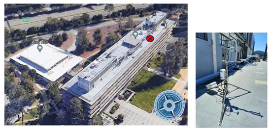 The experimental setup location on the roof of Spanagel Hall (left) and the instruments utilized to obtain the macroscopic meteorological parameters (right).