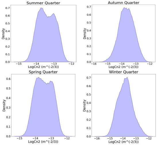 The data obtained spanned a period of almost eleven months. That means that the meteorological parameters, primarily the temperatures, had a significant variance due to their seasonal dependence. To include this seasonal dependence on our analysis, as well as to have a more effective manipulation of the datasets, we divided the whole dataset in four distinct sets of almost equal size. These different sets represent, but not precisely coincide with, the four seasons. However, since they are almost a match to the four seasons, we treated each one of them as a season representative (i.e., autumn (1 September–20 October), winter (25 January–31 March), spring (1 April–30 June) and summer (1 July–31 August)), as shown in Datasets 1 through 4 [28]. This was done primarily to observe any seasonal effect on the . Table 1 summarizes the descriptive statistics of over each season as well as the corresponding statistics for the entire experimental period. Figure 2 also presents the distribution plot of , in a logarithmic scale, for every season. Apparently, the refractive index parameter is a very complex metric to extract definite conclusions, since multiple non-linear phenomena affect its value; however, an approximate analysis can be done. To that end, Figure 3 shows the daily moving average for the entire period of every season. We notice that during winter, exhibits, in average, the lower values in contrary with summer where we observe the higher values. This is partially supported by the fact that the mean observed value of in winter is the lowest, whereas in summer is the highest. It is interesting though to mention that during winter we observed a higher maximum value for than in summer. During spring and autumn, the corresponding mean values reside within the rest two. In general, the time series of all seasons, follow the same pattern. Another characteristic of values is that during winter and autumn we observed much lower variances as compared to summer and spring (Figure 2).