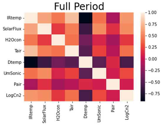 Finally, the correlation between the measured atmospheric parameters and for the entire period, is depicted in the heatmap of Figure 4. In this figure, we have included an additional parameter Dtemp, defined as the difference between the ground and the air temperature, which has a significant negative effect on . The darker a cell the stronger the anti-correlation between the corresponding two parameters. On the other hand, a lighter cell corresponds to a stronger correlation.