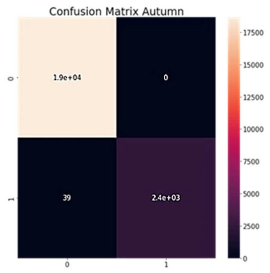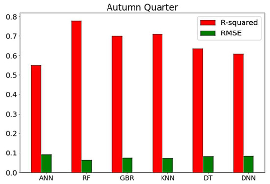 The results for the RF algorithm in our data set gave a significantly improved coefficient of determination, R2, for the model evaluation of 0.78 which was the best value among all algorithms for autumn. An ensemble of 300 different trees was sufficient to construct the model with the highest possible accuracy. Additionally, an RMSE = 0.064 showed a great improvement in the error of the predicted values.