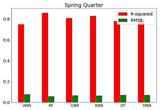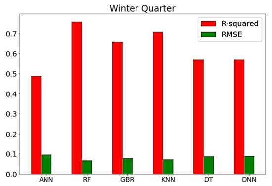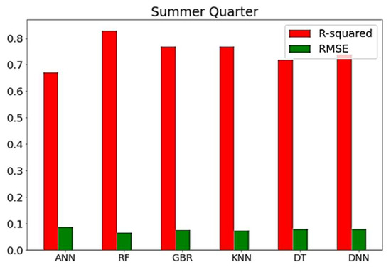 To conclude this section, it is important to comment on the overall performance of each algorithm. RF appeared to be the best, since it achieved the highest metrics values on every season. Interestingly, the next best was KNN, followed closely by GBR. DT and DNN also demonstrated similar performance to each other, but poorer than GBR. Finally, ANN had the worst fit over all datasets.