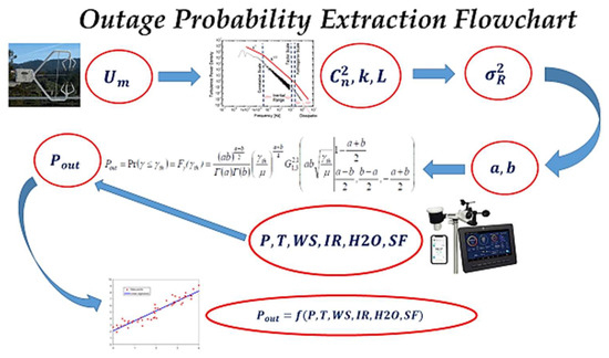 The outage probability of a notional FSO link extraction flowchart. The sonic anemometer measurement allows for the extraction and consequently the Rytov variance which is used for the alpha and beta parameters. Equation (18) applies those values and calculates the outage probability which later on is modeled based on the experimentally measured atmospheric parameters.