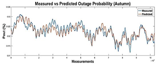 Figure 15 plots the predicted values of Pout obtained from Equation (20) against the measured values obtained from Equation (18) for the autumn dataset. The daily mean value—instead of raw data—for both values has been used for a clearer depiction. We notice that the model’s predictions follow the general trend of the experimental Pout, thus it can be used to give very good estimates for the performance of an FSO link.