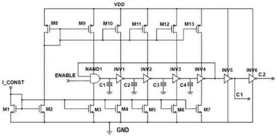 This architectures downside is that M1 and M8 transistors are in diode configuration. Thus their drain−source voltage is well fixed and equal to their gate−source voltage, while nMOS transistors M2–M7 and pMOS transistors M9–M13 VDS are supply voltage dependent. This will cause a shift in the logic gates propagation delay and the C1−C4 capacitor’s charge/discharge time with the supply voltage, given by the drain current short−channel effect; hence the ring VCO frequency is affected. Moreover, the gate−source voltage of the M1 and M8 transistors is complementary to absolute temperature (CTAT), leading to a change in frequency with temperature.