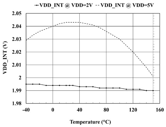 In this subchapter, schematic level simulations were performed in the Cadence Virtuoso environment work system using a 250 nm CMOS technology. Figure 5 shows the internal constant voltage change with temperature. The curvature determined by the bandgap voltage characteristic can be observed. For the 2 V supply voltage, a waveform flattening occurs due to the very small difference between and . This will determine the low−dropout circuit output stage ( transistor) to work in the linear region. This will lead to a smaller fluctuation in the internal constant voltage even with the process and mismatch.