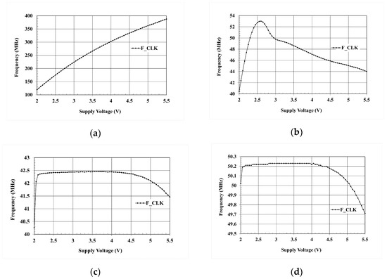 In the second picture (b), the current−starved ring oscillator is designed and simulated. The frequency range is considerably decreased compared to (a), with a minimum frequency reached at 2 V (40.43 MHz) and a peak value around 2.6 V (53 MHz). The third one (c) uses both the current−starved architecture and the internal supply voltage generated by the LDO. The frequency range is tighter (40.25 MHz; 42.45 MHz); thus, the frequency stability when changes is improved. A decrease in frequency can be observed when the supply voltage exceeds 4 V, with a local minimum value of 41.45 MHz being reached.