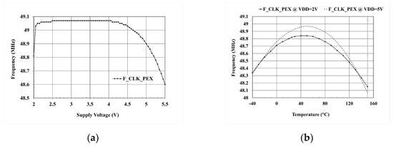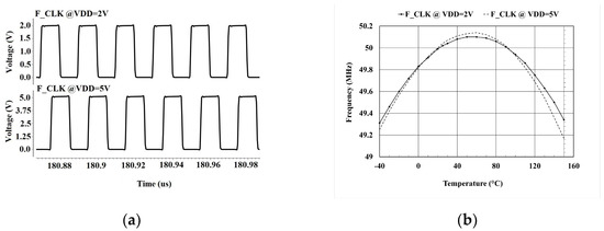 Figure 7b illustrates the frequency variation in a typical corner with temperature for the same supply voltages. The constant current and the potentials are derived from a circuit that uses bandgap voltage theory [16]. The same curvature with temperature for the clock frequency is obtained. Typical peak values of 50.1 MHz (for ) and 50.15 MHz (for ) are recorded around 60 °C, while the minimum value (49.2 MHz) was reached for 5 V supply voltage at 150 °C. The temperature percentage error obtained using the formula below is 1.6.