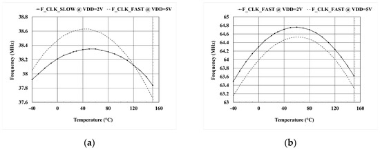 A decreased center frequency value of around 38.3 MHz (for ) and 38.5 MHz (for ) was obtained due to the lower constant current generated in this corner. In the fast corner (Figure 8b), the transistor’s threshold point is shifted to a lower value, leading to the decreased VGS voltage needed to turn the devices on. An increased average frequency value of around 64.1 MHz (for ) and 63.9 MHz (for ) is obtained. Compensation with temperature and power supply is achieved even in these corners, representing the worst process variation scenarios. To further reduce the curvature, second−order compensation for the bandgap circuit has to be implemented.