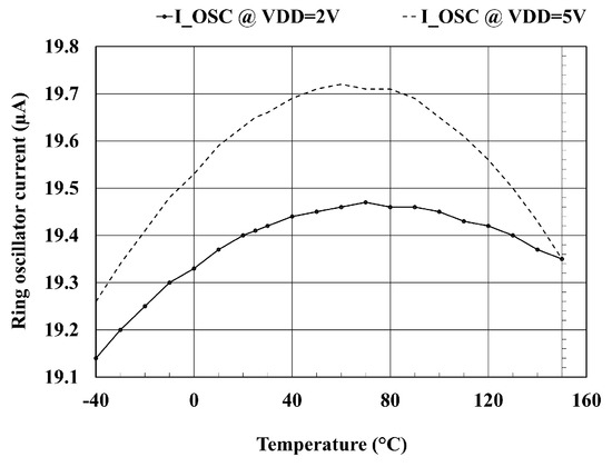 The average current consumed by the designed ring oscillator doesn’t exceed 20 µA regardless of supply voltage, as seen in Figure 9. The entire circuit that includes all the functional architecture blocks requires less than 125 µA.