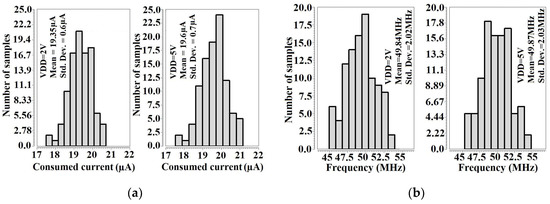 Figure 10b presents, at room temperature, the Monte Carlo simulation results over the total current consumed by the proposed ring oscillator for the same supply voltages as mentioned above. The means and standard deviations are 19.35 µA and 0.6 µA for , respectively 19.6 µA and 0.7 µA for . The maximum current is listed in Table 3.