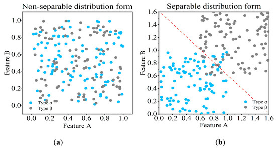 The problem of classification is to find a boundary to divide the groups into different categories. This requires effective separable distribution of different groups. Figure 1 shows an illustrative example of the non-separable distribution form of groups and the separable distribution of groups. It can be observed that the distribution of the two fault types in Figure 1a is similar and difficult to distinguish. The two fault types in Figure 1b can be easily separated by a boundary line. If the distribution of fault types corresponding to each label satisfies the separability assumption, the probability value of each label output by the classification model represents the distance between the input sample and the label in an n-dimensional space composed of n features.