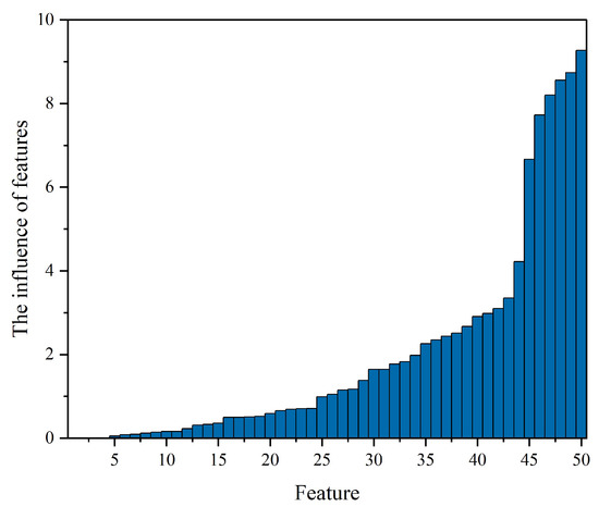 Random forests are used to capture the importance ranking of features to select relatively important features, as shown in Figure 4. The random forest method is then used to remove features with less than 0.5% influence. The first 15 features in Figure 4 are also removed because of their low correlation. Finally, the 35 most influential features are put into the fault diagnosis and warning model. The dataset uses the “S1|S2” feature as the status label of the engine, which is marked as normal or fault states. A detailed description of the 50 features in Figure 4 is shown in Table 3.