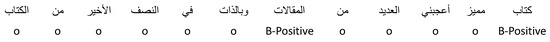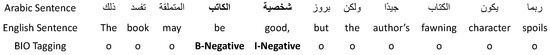 For Arabic ABSA, the HAAD dataset [8] is the main accessible dataset. The HAAD dataset contains 1513 reviews of Arabic books, each of which was described using aspect terms, APD, ACD, and ACP. There are 2838 aspect terms in HAAD altogether. With regard to both the training and testing datasets, Table 1 presents a summary of the statistics for the sentiment polarity classes, including positive, negative, conflict, and neutral. Figure 2 shows an example of an annotated HAAD sentence.