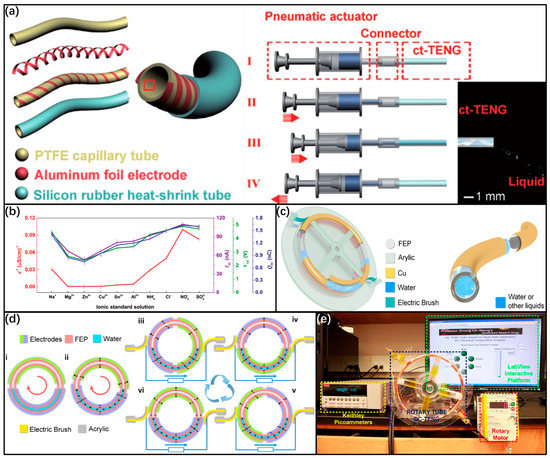 In 2016, Chen et al. designed a self-powered microfluidic sensor to detect the flow of liquid droplets through the output signal generated by a conversion electrode. A demonstration of patient infusion process monitoring shows that as the infusion rate increases from 3.14 to 62.8 μL/s, the frequency of the output signal increases from 0.2 to 3.0 Hz. This system has shown great advantages in creating self-powered microfluidic devices [39]. In 2017, Chen et al. designed a capillary TENG (ct-TENG) capable of biochemical detection of microfluidics. They used PTFE as the inner wall of the capillary and double-helix aluminum as the electrodes. The model and operating principle of the system are shown in Figure 2a. Microliter sampling can be achieved with high flexibility. The system uses the conversion electrode to convert the motion signal of the droplet into an electrical signal. The study found that the output signal of ct-TENG can judge the categories of water due to the current generated by different water being different. The ct-TENG also can sense trace liquids of different volumes. In addition, the electrical output results obtained by using the system to detect ten standard ion solutions, such as Na+, Mg2+, and Zn2+, are consistent with the conductivity curve measured by the conductivity meter (Figure 2b). In terms of biological monitoring, using the system to detect the total oxygen demand of drinking water can determine whether the drinking water is suitable for drinking. This provides new opportunities for multifunctional sensing and microfluidic biochemical detection technologies [41]. Pan et al. designed a U-TENG in solid–liquid mode and used various liquids to detect the effect of liquid type on TENG’s output. The experimental results show that the Voc generated by pure water is 81.7 V and generated by sandwich water is 350 V. They use conversion electrodes to collect the mechanical energy of the liquid and turn it into electrical energy, and successfully lit 60 LEDs and powered a thermohygrometer [42]. Kim et al. prepared PDMS-based microfluidic channels and injected different liquids. The results demonstrate the possibility of detecting liquid species and impurities in liquids by transmitting signals through a conversion electrode. This microfluidic system, as a multi-liquid sensor, is expected to provide a convenient method for the biomedical and chemical industries to detect the type, and physical and chemical properties of the droplet [43].