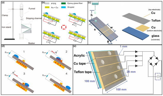 Yuan et al. designed a tubular TENG based on solid–liquid contact charging. For detecting subtle differences in touch, press, and stretch pressures [45]. Shahriar et al. designed a mechano-sensing element based on flexible fluids and a conversion electrode in which droplets flow in micro-hydrophobic channels of the polymer, which can generate an output voltage of 20 mV when a pressure of 40 mbar is applied to the electrodes [46]. Wang et al. designed a DC output TENG using the liquid medium interface. It consists of FEP tubes and copper electrodes, and its structure and working mechanism are shown in Figure 2c,d. The contact between the liquid and the copper particles as the fluid dielectric and the FEP tube generates triboelectric charges, which are transported by the conversion electrode. Sandwiching three such structures yielded open-circuit voltages as high as 550 V. This TENG possesses a more powerful energy harvesting capability, which greatly facilitates its development in DC self-powered systems. At the same time, combined with microfluidic devices, it can also be used for biochemical analysis and water quality testing (Figure 2e) [44]. Zhong et al. designed a droplet TENG, which can sense the droplet’s movement through the conversion electrode and collect the generated mechanical energy. When the electrode plate length is 0.2 m, 0.4 m, and 0.6 m, the open circuit voltages are 0.89, 5.48, and 4.87 V. The mechanism is shown in Figure 3a,b [47]. Subsequently, Karthikeyan et al. and Zhang et al. proposed a tubular TENG for harvesting water wave energy, which can be collected and converted into electrical energy through corresponding conversion electrodes. These works are of great significance for the development of microfluidic-based TENG [48,49]. Xu et al. proposed an optimized TENG structure with a top conversion electrode to harvest the mechanical energy of droplet motion (Figure 3c,d), which can generate Isc of 0.48 μA. The improvement of detection speed is about 1000 times compared with the application of microfluidic sensors for droplet detection, which provides a new idea for the design of triboelectric microfluidics. The system and its external circuit diagram are shown in Figure 3e [50].