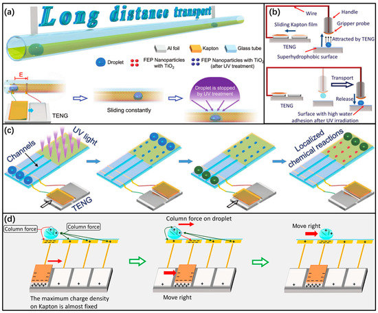 - Nie, J.; Ren, Z.; Bai, Y.; Shao, J.; Jiang, T.; Xu, L.; Chen, X.; Wang, Z.L. Long Distance Transport of Microdroplets and Precise Microfluidics Patterning Based on Triboelectric Nanogenerator. Adv. Mater. Technol. 2019, 4, 1800300. [Google Scholar] [CrossRef]