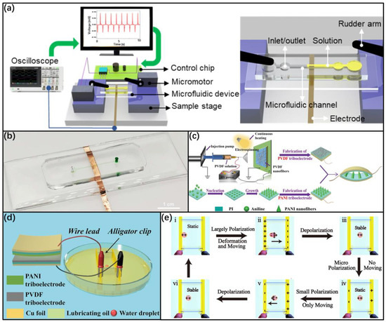 Combined with the TENG, Zhou et al. came up with a self-powered microfluidics sensor. This system drives the target solution to flow through the microfluidics channel through the drive capacitance and detects the ion concentration of the target solution according to the generated electrical signal. They also used this system to monitor the degradation of 4-nitrophenol. The model of the systems is shown in Figure 5a,b [55]. Yu et al. built a self-powered droplet processing device. This device consists of brushes, the TENG, and microfluidic devices. As a high-voltage source, the TENG, combined with different brushes and microfluidic devices, can realize different operations on droplets such as moving, separating, mixing, transporting, etc., through the drive capacitance. The results show that the system can drive droplets to complete a long-distance linear motion, and can also drive droplets to move in the circular track composed of 40 electrodes simultaneously. Additionally, it can break up droplets with volumes up to 400 μL. Compared with the traditional mixed droplet method, the system can increase the mixing speed of droplets by 6.3 times. It can be seen that this self-powered microfluidics system has high applicability in the development of drug delivery and biochemical analysis [56]. To address the limitations of current droplet control techniques, Sun et al. assembled a novel self-powered electrostatic operating system with the TENG based on novel polyaniline and polyvinylidene fluoride nanowires. Figure 5c shows the manufacturing process. TENG’s output signal is exerted on both ends of the drive capacitance and the driving target is also low to complete different motions (Figure 5d,e). This driving method is 3.63 s shorter than the conventional DC electric field. This new method of controlling the movement of target droplets has shown great advantages in the biochemical detection and directional delivery of drugs [57]. In addition, Zhou et al. also conducted a series of research on this technology. They came up with a self-powered microfluidics system. The TENG acts as a high-voltage source, applying a signal across the drive capacitance. Combined with the microfluidics system, the AC electroosmotic flow and the induced charged electroosmotic flow in the microfluidics channel are successfully realized and the two fluids are mixed. They also used this system to realize the aggregation and separation of particles [58]. Wang et al. designed a strategy for the TENG to power microfluidics systems. When TENG’s output voltage is exerted on the drive capacitance, it can drive the movement of particles. On this basis, they further designed a self-powered capillary filling and micro-forming method, which made it easier to fabricate microstructures [59]. Although the high-voltage output of the TENG is difficult to use directly as a power source, applying it to the drive capacitance and combining it with a microfluidics system can precisely control the target droplet. This technology is expected to be used in drug delivery, biochemical detection, etc., and other fields have achieved rapid development [60].