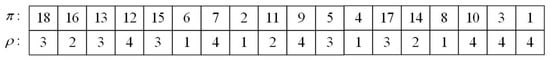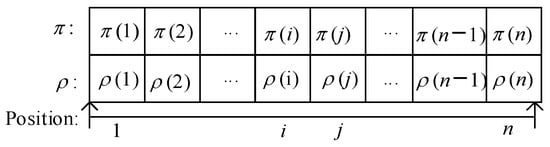 The pre-solved problems of the scheme proposed in this paper involves the sub-problem of operation arrangement and the sub-problem of machine selection. Therefore, in this paper, we apply the individual representation method to the double chain, that is, use the process chain and the equipment chain to jointly represent the individuals in the population, as shown in Figure 2. For the sub-problem of operation arrangement, we use the operation chain π to represent it, that is, π(i) means that the process Oπ(i) is ranked in the ith position of the process chain. For the sub-problem of machine selection, we use machine chain ρ to represent it, that is, ρ(i) indicates that the operation Oi is processed on the machine ρ(i).