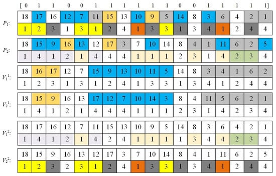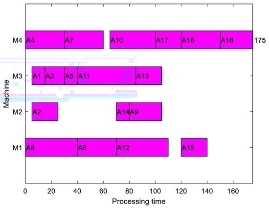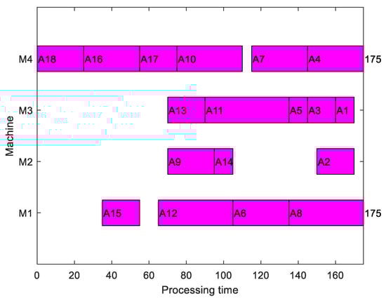 As the idea of reverse order scheduling is adopted in this paper, when an individual is decoded as a specific scheduling scheme, the generated Gantt chart is still in the form of reverse order. In order to obtain a positive sequence scheduling, we adopt the conversion strategy based on the completion time flipping [] that we previously proposed. When the proposed conversion strategy is used to convert the scheduling scheme shown in Figure 4, the final positive scheduling scheme is shown in Figure 9.