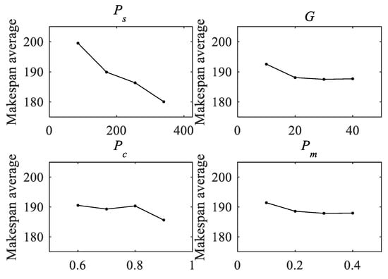 This chapter adopts the Taguchi experimental design method to test which set of parameters makes the algorithm perform better []. Firstly, it is tested by using the calculation example I_85_5_1, 85_5, which indicates the running time and the size of the amount of data involved (n = 85, m = 5), and one indicates the first calculation example mentioned in this paper. There are four parameters that need to be focused on in this algorithm: Population size (Ps), crossover probability (Pc), mutation probability (Pm), G (If the current solution of the algorithm does not become better in consecutive G generations, then Algorithm execution stops). Four levels of impact factors are divided, and the combinations of different parameter values are shown in Table 2. Select the orthogonal array L16(44). For each different parameter combination, the algorithm needs to be run 30 times, and the average completion time obtained from 30 runs is taken as the experimental index. The final experimental results are shown in Table 3. The changes of the experimental indicators affected by each parameter are shown in Figure 11.