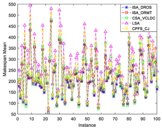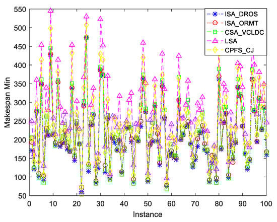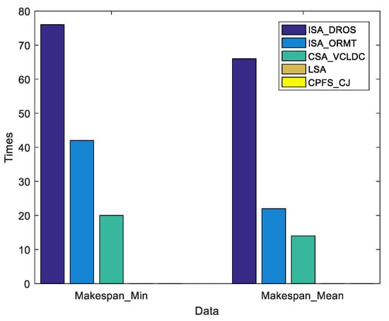 In the process of solving 100 calculation examples, for each calculation example, when each algorithm is run independently for 30 times, the minimum time required for the completion of product processing is shown in Figure 12, and the average completion time obtained is shown in Figure 13. It shows that most of the change curves of the minimum completion time and the average completion time of the algorithm ISA_DROS proposed in this chapter are located below the entire graph. Figure 14 summarizes the results in Figure 12 and Figure 13. The second set of data is the statistics of the average completion time results shown in Figure 13, in which the algorithm ISA_DROS obtains the optimal solution of 66 instances, the algorithm ISA_ORMT obtains the optimal solution of 22 instances, and the algorithm CSA_VCLDC can only solve 14 instances The optimal solution of the algorithm CPFS_CJ and LSA did not obtain the optimal solution. Since the algorithms CPFS_CJ and LSA are both rule-based heuristic algorithms, we only counted the average running time of several other comparative algorithms, as shown in Figure 15. It can be clearly concluded that the solving ability of the algorithm proposed in this paper is better than other comparison algorithms.
