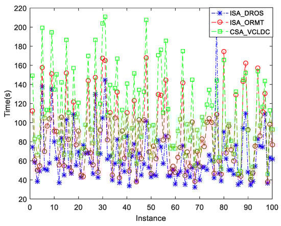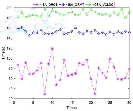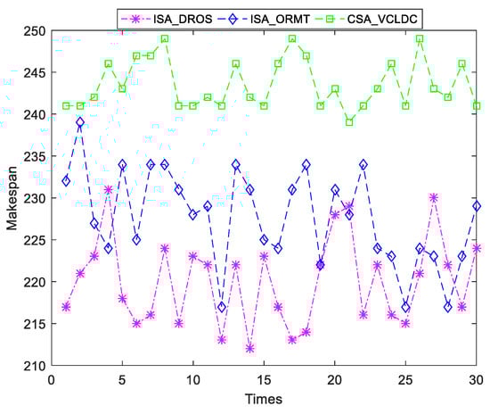 Figure 16 shows the completion time obtained by running the algorithms ISA_DROS, ISA_ORMT and CSA_VCLDC 30 times independently for a single randomly generated instance. Figure 17 shows the running time during the algorithm solution process. It can be seen from Figure 16 and Figure 17 that the algorithm ISA_DROS proposed in this paper is better than the other three algorithms.