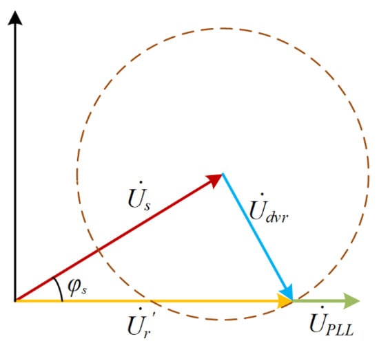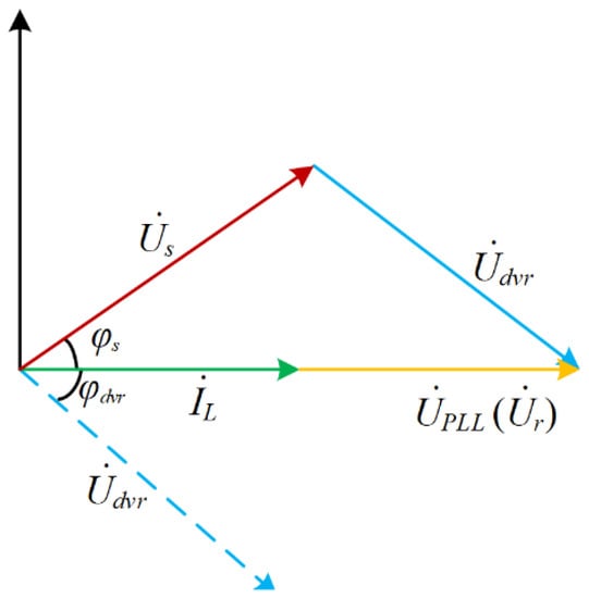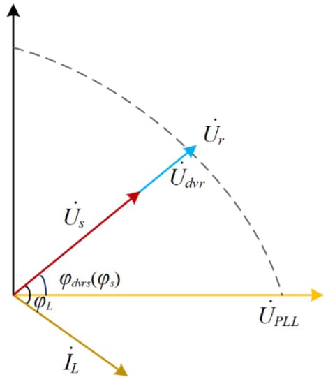 According to Equation (11), the compensation voltage of EOC-DVR is related to the phase angle of active power output. Assuming , the compensated reference voltage phase is obtained according to the following Equation (11):