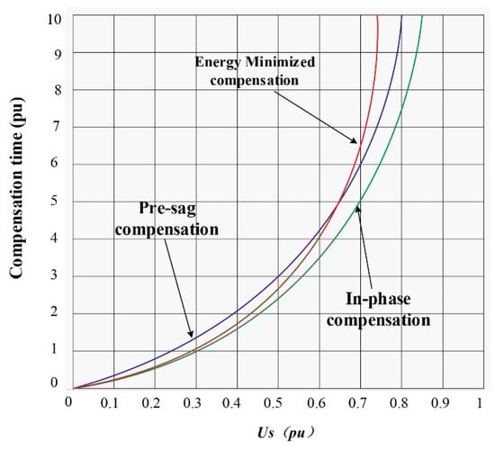 When , the energy-minimized compensation can realize the infinite length of compensation duration. Figure 5 shows the compensation duration of the three compensation strategies when the voltage of the grid jump angle is 10° and the load power angle is 30°. Figure 5 shows that the energy-minimized compensation provides the longest compensation duration only when the amplitude of voltage sag is small, and the pre-sag compensation provides the longstanding compensation duration when it is deeper.