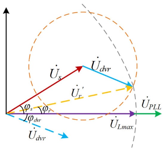When voltage compensation is limited, the minimum phase jump of load side voltage compensation should be set as the goal, according to the rule of pre-sag compensation. Based on this goal, this paper proposes to adjust the amplitude of reference voltage within the allowable range of load voltage and reduce the amplitude of reference voltage. The output limit voltage of the EOC-DVR is taken as the compensation voltage (i.e., ), and the load voltage after compensation determines the load reference voltage according to no phase change. At this time, the maximum value that the EOC-DVR can compensate for is based on ensuring that the load voltage phase does not change. The adjustment is shown in Figure 7. The small circular arc is the compensation range of the EOC-DVR limit voltage. Currently, the load reference voltage can be obtained as:
