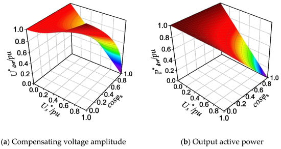 According to Equation (20), the output voltage of the energy-minimized compensation mode is graphically represented, as shown in Figure 9. In the figure, the x-coordinate is the grid voltage per-unit value , the y-coordinate is the PF of load , and the vertical coordinate is the compensation voltage amplitude per-unit value .