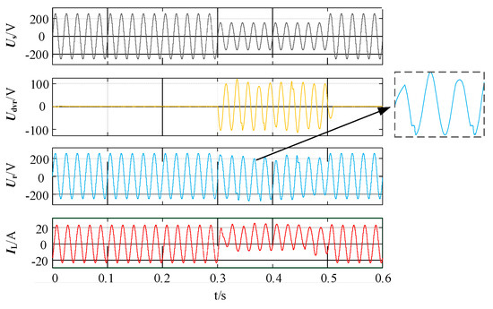 When the limit compensation voltage of the EOC-DVR change, which may cause , calculated by Equation (5), to be greater than the limit compensation voltage of the EOC-DVR. Therefore, the integrated energy optimal compensation switches to pre-sag compensation mode, according to the analysis in Section 2.1, when the voltage sag is relatively deep. Thus, the limit voltage compensation is realized based on the pre-sag compensation mode.