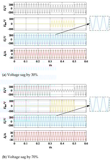 According to Equation (16), when , the formula is true. If the voltage sag is too deep, , the EOC-DVR device will output active power.